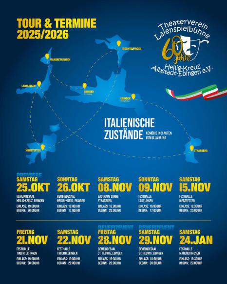 Danach geht der Theaterverein auf Tournee. Am Samstag, 8. November, gastiert er um 20 Uhr in der Straßberger „Sonne“, am Sonntag, 9. November, ab 17 Uhr in der Lautlinger Festhalle und am Samstag, 15. November, in der Festhalle Meßstetten – Aufführungsbeginn ist um 20 Uhr; Karten gibt es ausschließlich an der Abendkasse.