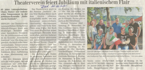 Nächster Spielort ist der Gemeindesaal St. Hedwig im Ebinger Westen, und zwar am Freitag, 28., und am Samstag, 29. November – Beginn ist immer um 20 Uhr, Vorverkaufsstelle ab dem 13. Oktober der Klösterle-Verein, Telefon 07431/71 869 und 0175/ 7981840. Eine Abendkasse gibt es auch.