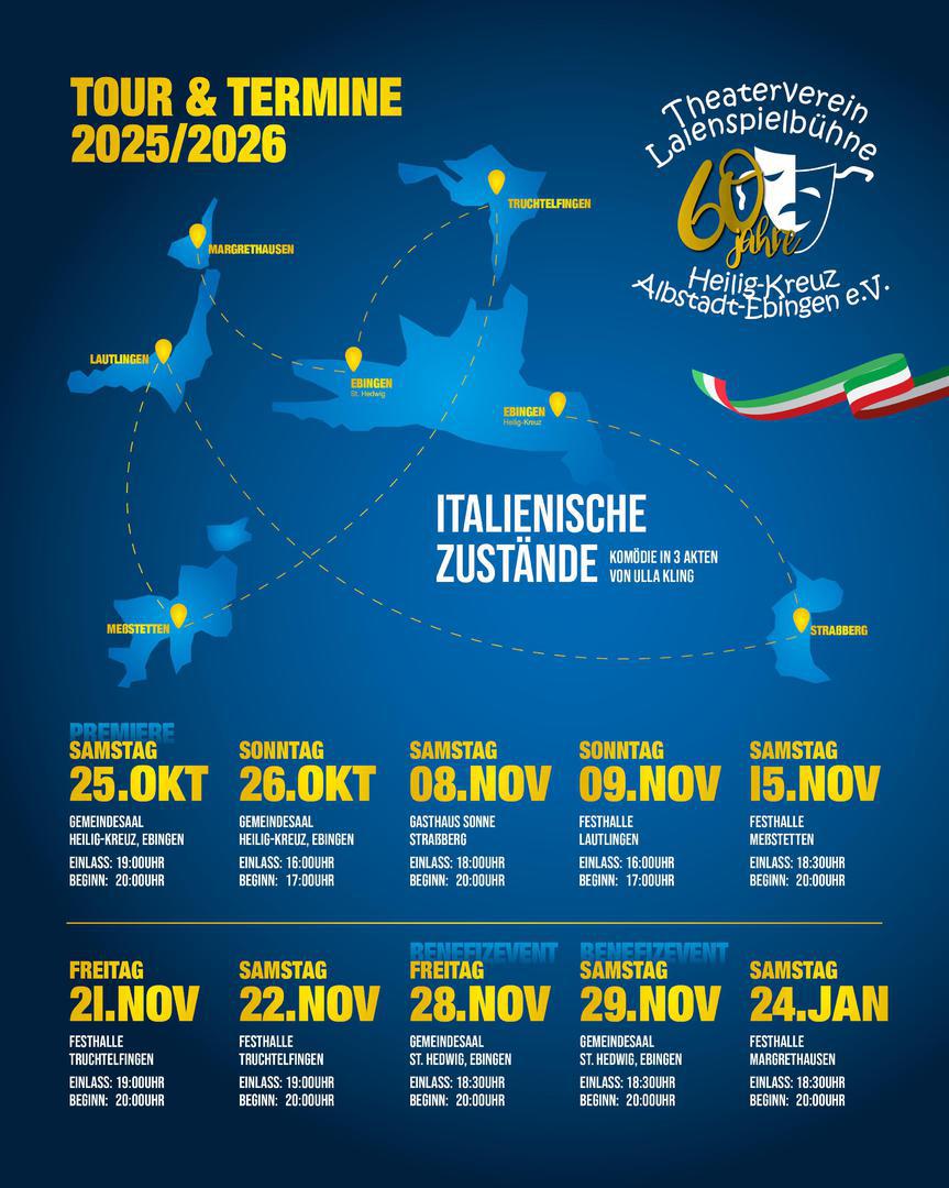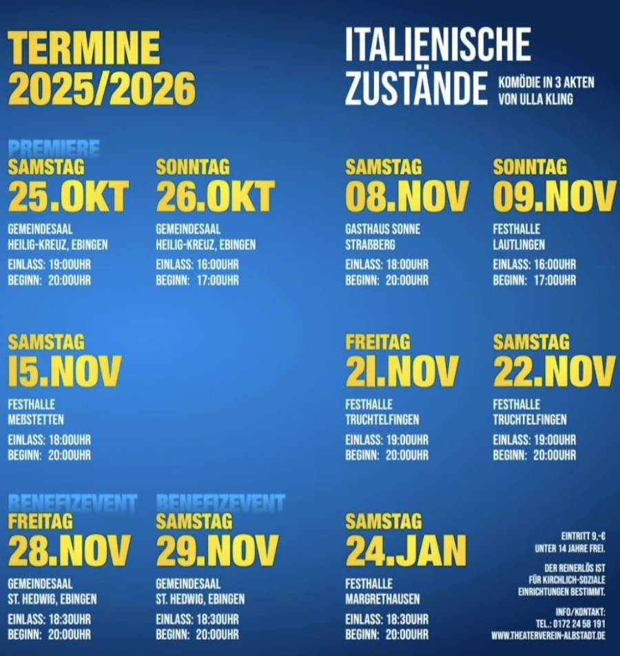 Die Premierenvorstellung geht am Samstag, 25. Oktober, im Ebinger Gemeindesaal Heilig-Kreuz über die Bühne und beginnt um 20 Uhr. Eine zweite Vorstellung folgt anderntags um 17 Uhr; Karten gibt es, außer an der Abendkasse, bei Getränke Biesinger in Ebingen, und zwar von der kommenden Woche an.