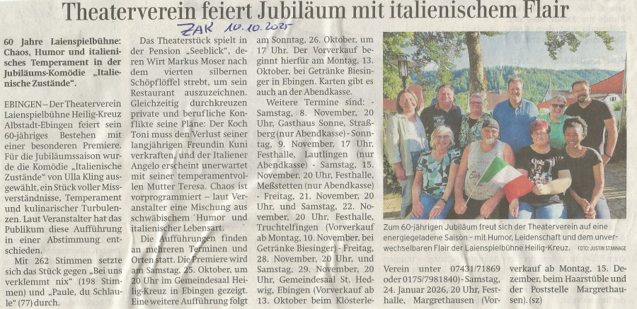 Wie ist es da hingekommen? Ganz einfach: Das Publikum wollte es so. Alle Zuschauer des Theatervereins durften im vergangenen Jahr darüber abstimmen, welches Stück die Laienspielschar des Theatervereins erneut inszenieren sollte. Mit 262 Stimmen setzten sich die „Italienischen Zustände“ souverän gegen „Bei uns verklemmt nix“ durch, das 198 Stimmen erhielt. Auf Platz drei landete „Paule, du Schlaule“ mit 77 Stimmen. Das Albstädter Theaterpublikum hat offensichtlich ein Faible für die Kombination von italienischem Chaos und schwäbischem Humor.